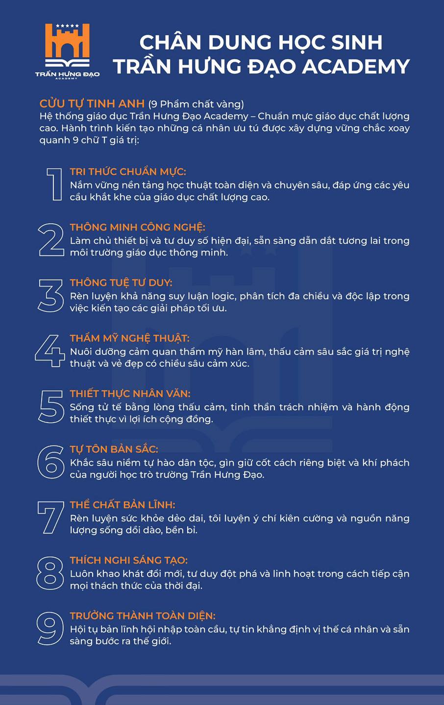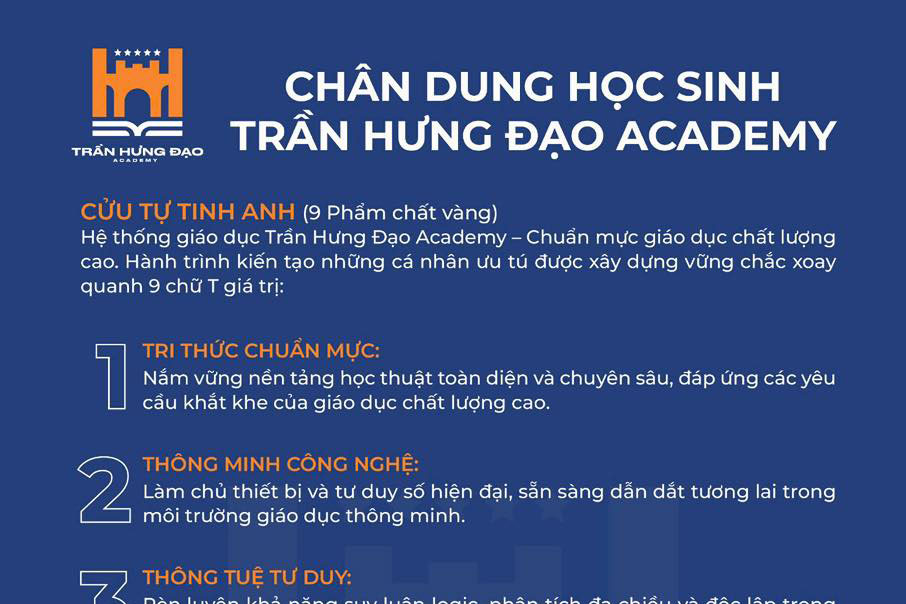 Hệ thống giáo dục Trần Hưng Đạo Academy – Chuẩn mực giáo dục chất lượng cao. Hành trình kiến tạo những cá nhân ưu tú được xây dựng vững chắc xoay quanh 9 chữ T giá trị: