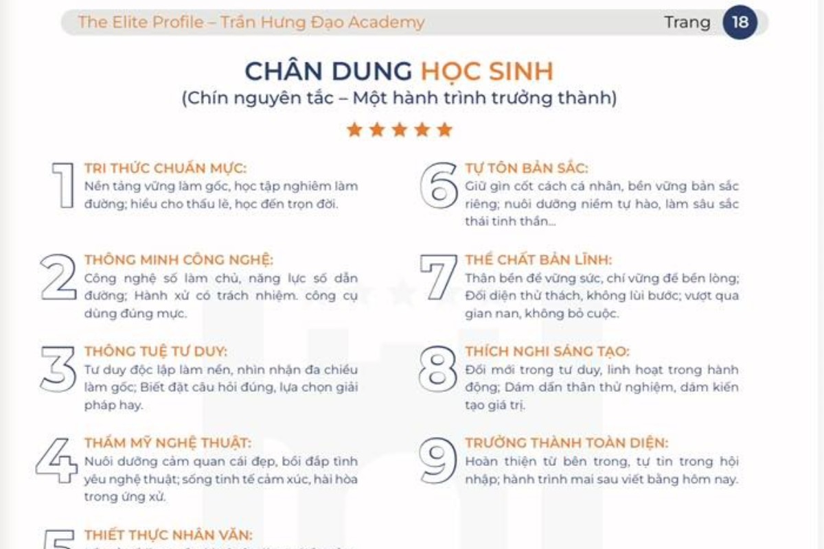 Sự chuẩn bị công phu về cả môi trường tư duy lẫn công cụ thực hành chính là cách Trần Hưng Đạo Academy giúp học sinh đứng vững trên đôi chân của mình. Khi thông tuệ tư duy được đặt trong chỉnh thể 9 phẩm chất, các em không chỉ học để thành đạt, mà học để trở thành những thủ lĩnh bản lĩnh, biết hỏi để thấu thị và biết chọn để kiến tạo. Đây chính là lời cam kết của chúng tôi: Trang bị cho học sinh một hệ điều hành trí tuệ vững chãi để các em chủ động làm chủ vận mệnh và kiêu hãnh khẳng định tầm vóc trí tuệ Việt rạng rỡ trên bản đồ toàn cầu.